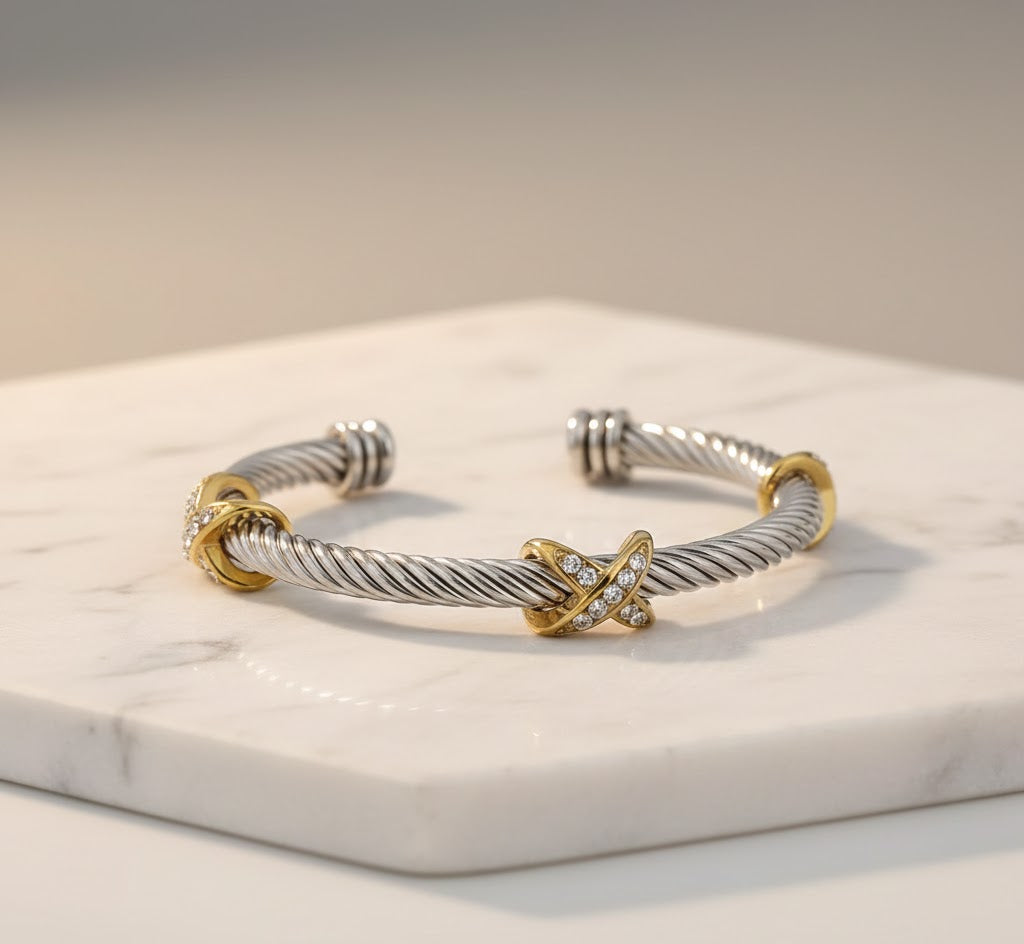 Designed for lasting wear, the Aurelia Helix bracelet combines durability with a smooth, comfortable fit on the wrist. The stainless steel base provides everyday resilience, while the zircon accents add subtle light and dimension. Balanced and versatile, it transitions seamlessly from daytime refinement to evening elegance, becoming a timeless addition to a curated jewelry collection.